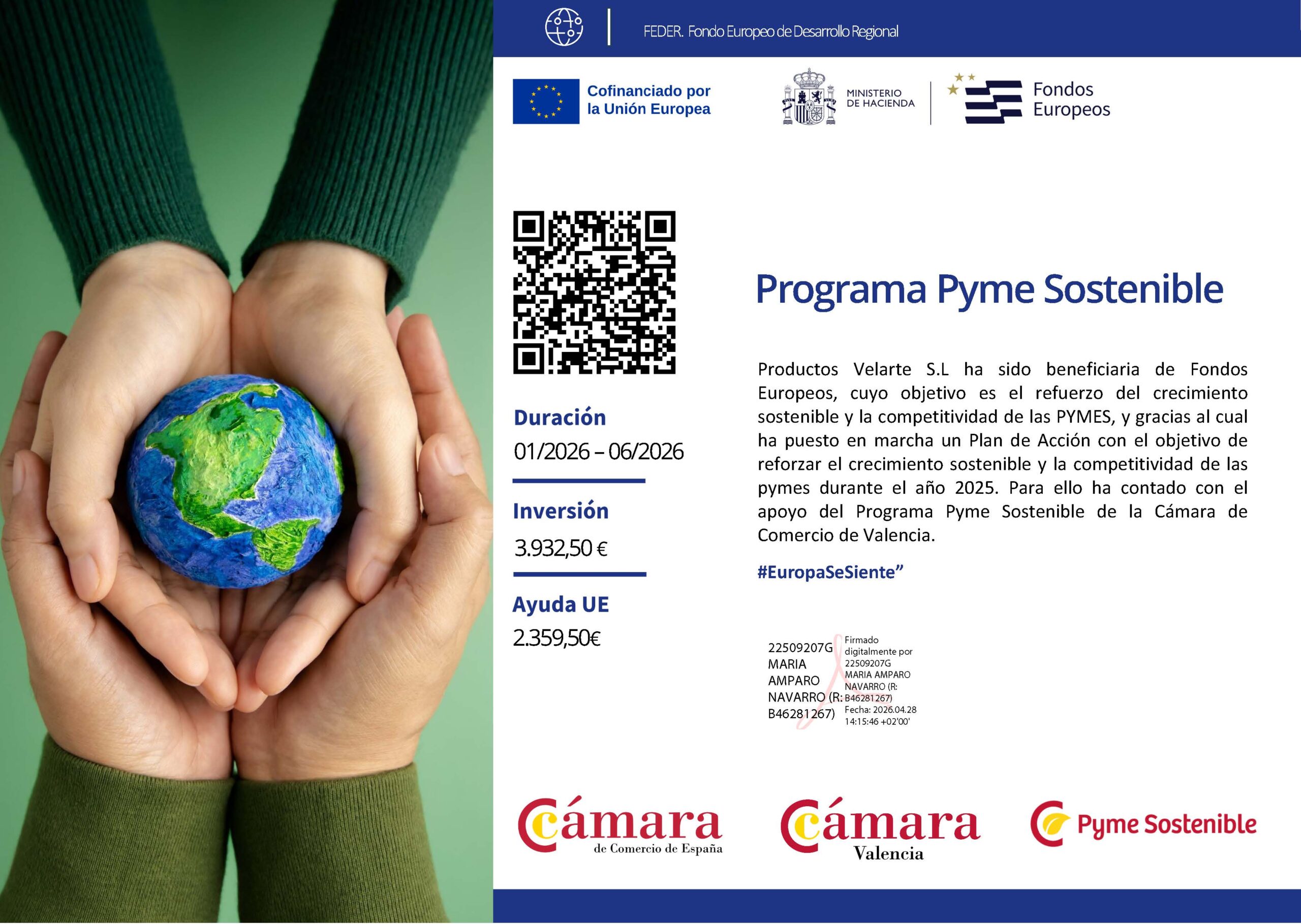 Productos Velarte S.L has ido beneficiaria de Fondos Europeos, cuyo objetivo es el refuerzo del crecimiento sostenible y la competitividad de las PYMES, y gracias al cual ha puesto en marcha un Plan de Acción con el objetivo de reforzar el crecimiento sostenible y la competitividad de las pymes durante el año 2025. Para ello ha contado con el apoyo del Programa Pyme Sostenible de la Cámara de Comercio de Valencia.