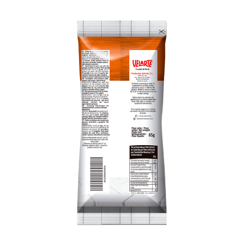 Harina de trigo, aceite de girasol alto oleico, semillas de girasol (4,1%), cacahuetes (4,1%), sésamo (3%), salvado de trigo (1,8%), sal, levadura y agente de tratamiento de la harina (ácido ascórbico).
