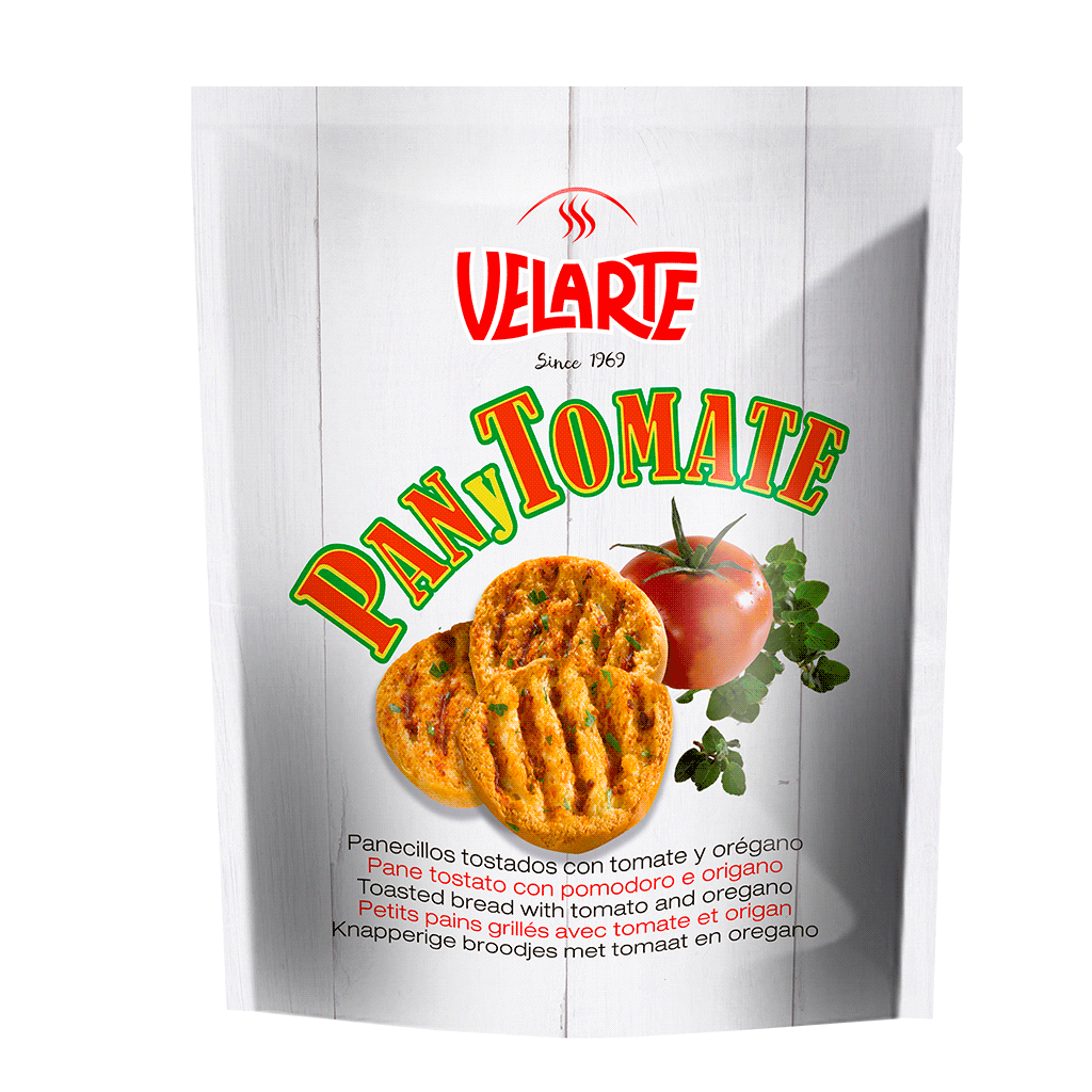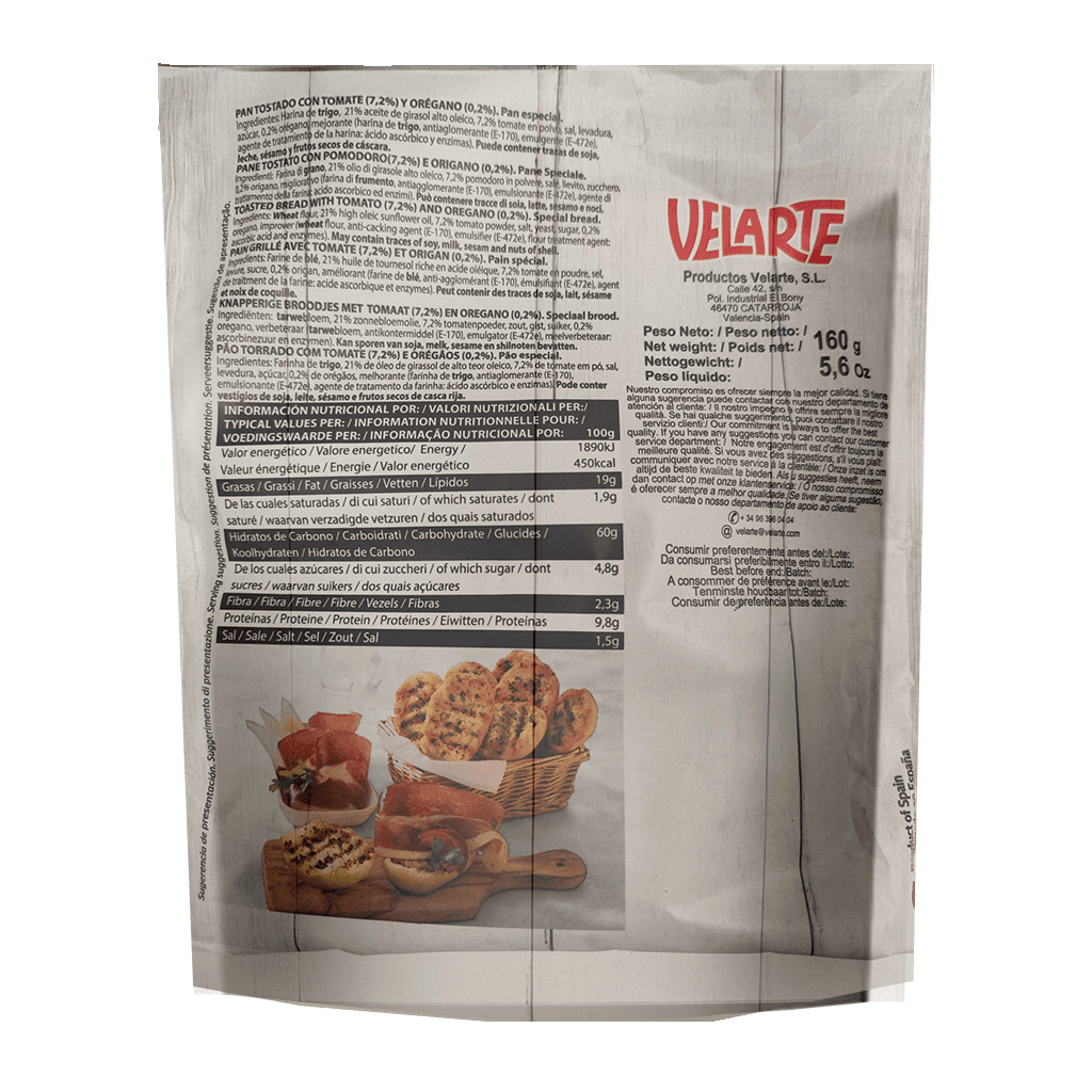 Harina de trigo, 21% aceite de girasol alto oleico, 7,2% tomate en polvo, sal, levadura, azúcar, 0,2% orégano, mejorante (harina de trigo, antiaglomerante (E-170), emulgente (E-472e), agente de tratamiento de la harina: ácido ascórbico y enzimas).