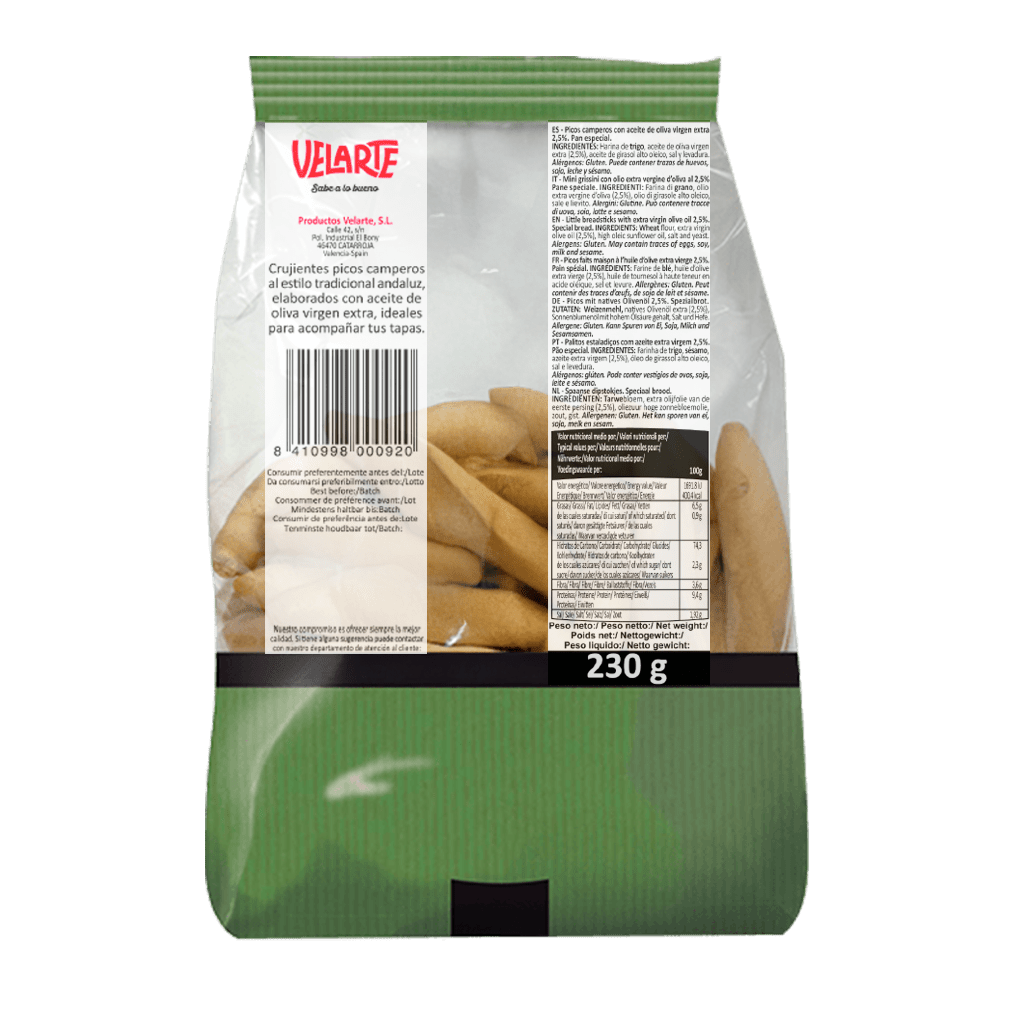 Harina de trigo, 5% aceite de oliva virgen extra (5%), sal y levadura. Alérgenos: Gluten.